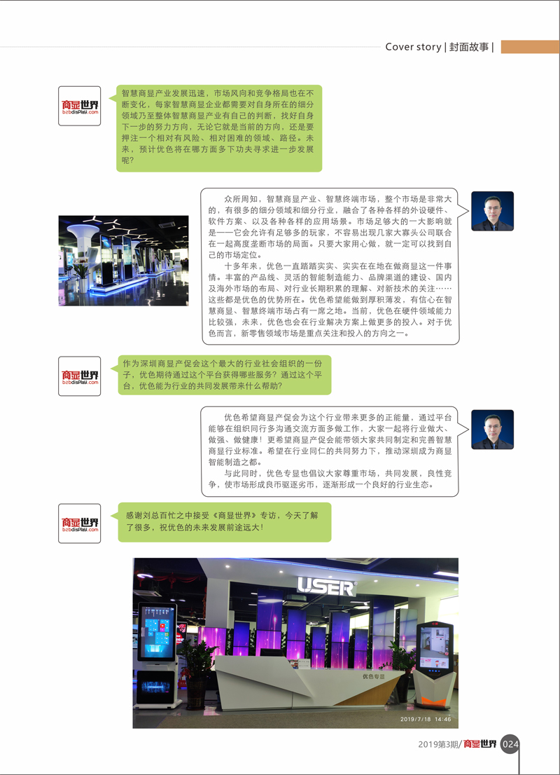 近日優(yōu)色專顯接受商顯世界專訪,在此次采訪中優(yōu)色總經(jīng)理劉峰認(rèn)真分析未來智慧商顯行業(yè)發(fā)展趨勢,講述優(yōu)色專顯自身的產(chǎn)品及業(yè)務(wù)布局概況,隨著高速5G和萬物互聯(lián)時代的到來,信息實時傳遞,數(shù)據(jù)存儲、智能云端,智慧商顯作為物聯(lián)網(wǎng)終端的重要載體,在人類生活的各種場景中會得到廣泛應(yīng)用。 優(yōu)色專顯本次專訪刊登在商顯世界2019年第03期,以下是專訪的詳細(xì)內(nèi)容與大家一起分享: