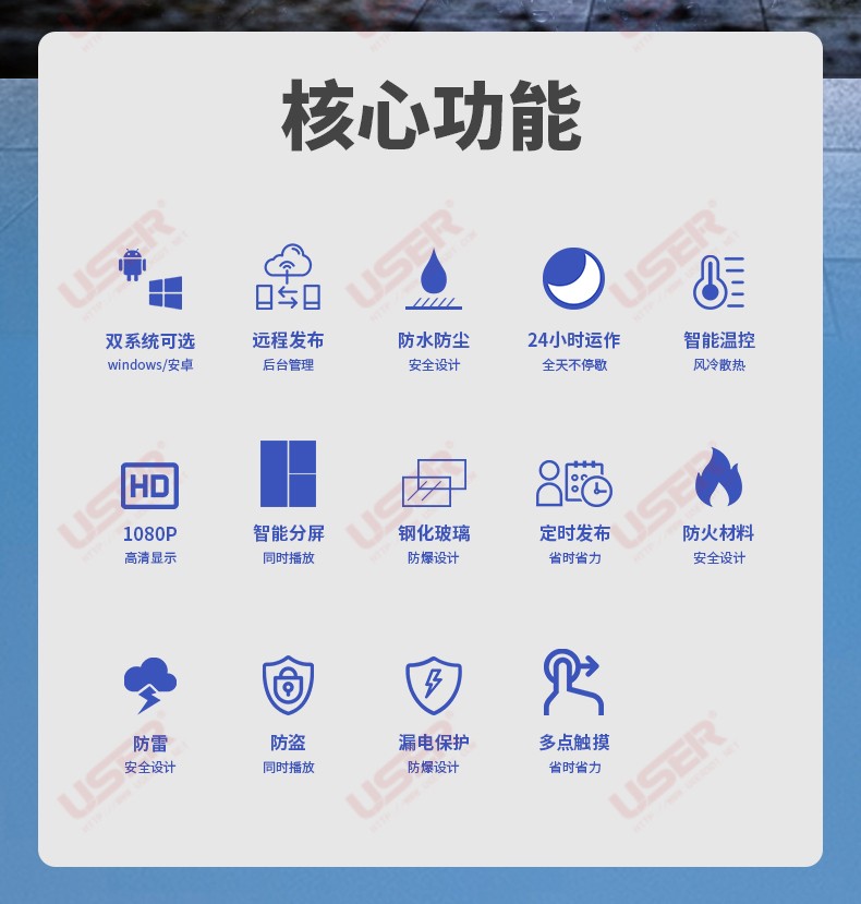簡(jiǎn)介:液晶尺寸:55英寸 1.整機(jī)采用風(fēng)冷方案,達(dá)到IP65防護(hù)等級(jí),防塵、防水,可完全安裝于室外; 2.高亮度的液晶顯示屏,配合自動(dòng)光感控制系統(tǒng)陽(yáng)光下可視; 3.具備溫控功能,在寬溫條件下可以正常工...
