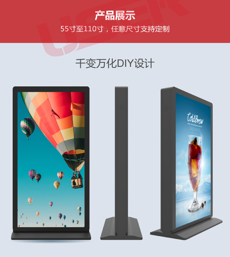 1.雙面戶外廣告機(jī),亮度可達(dá)到4000-5000nits ,太陽光環(huán)境下依舊清晰可視,壽命長,可持續(xù)運(yùn)行100,000小時;