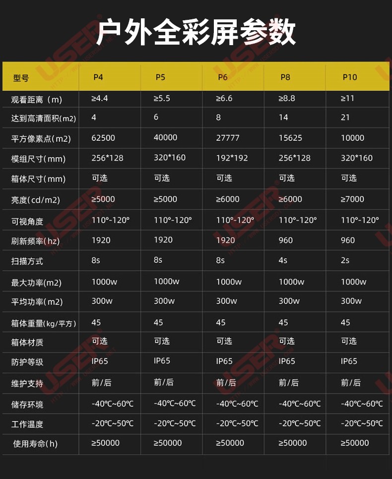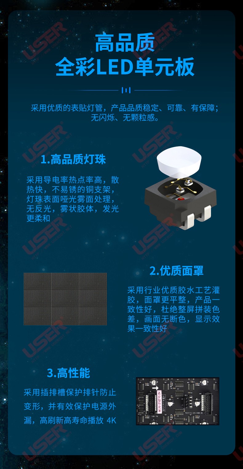 采用SMD1515燈珠,內(nèi)由紅色、綠色、藍色芯片組成,外由啞光黑支架封裝而成,墨色均勻,一致性好,對比度可達 5000:1,視角可達140°以上,可靠性高,使用壽命長。