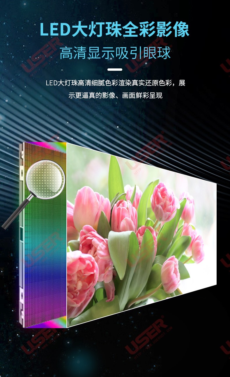 更小的像素間距,具有高密度顯示特性,適合近距離觀看,不易產(chǎn)生顆粒感。