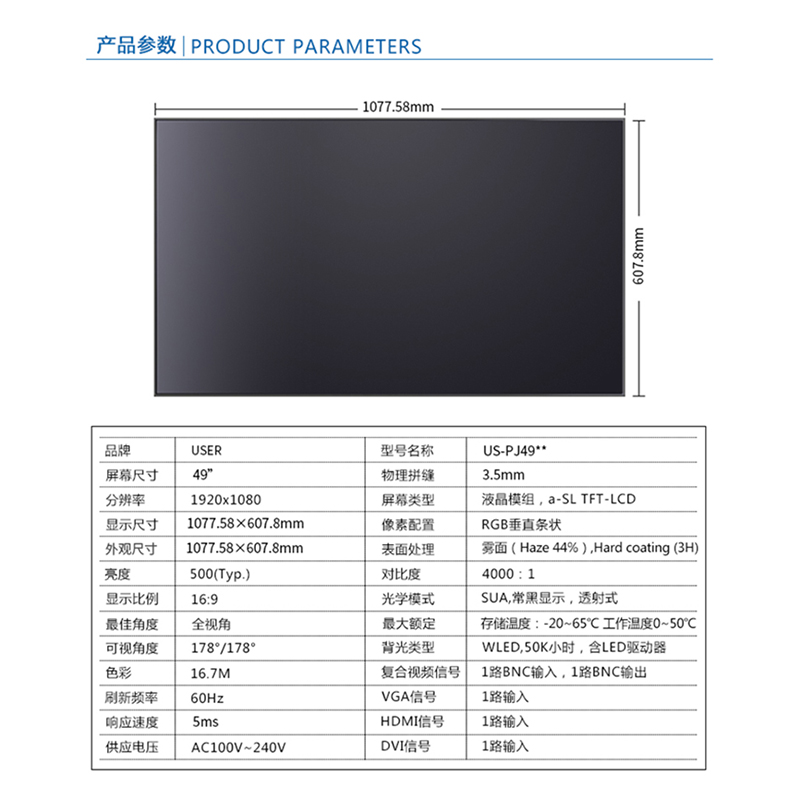 簡(jiǎn)介:◆ 型號(hào):US-PJ49** ◆類型:三星/LG/京東方BOE面板 ◆亮度:500-700cd/m2(可選) ◆超窄邊設(shè)計(jì),拼縫3.5mm ◆ 在ISO9001嚴(yán)格的質(zhì)量控制體系下生產(chǎn)? ◆ 色彩均勻,圖像穩(wěn)定,為拼接大畫面定制...